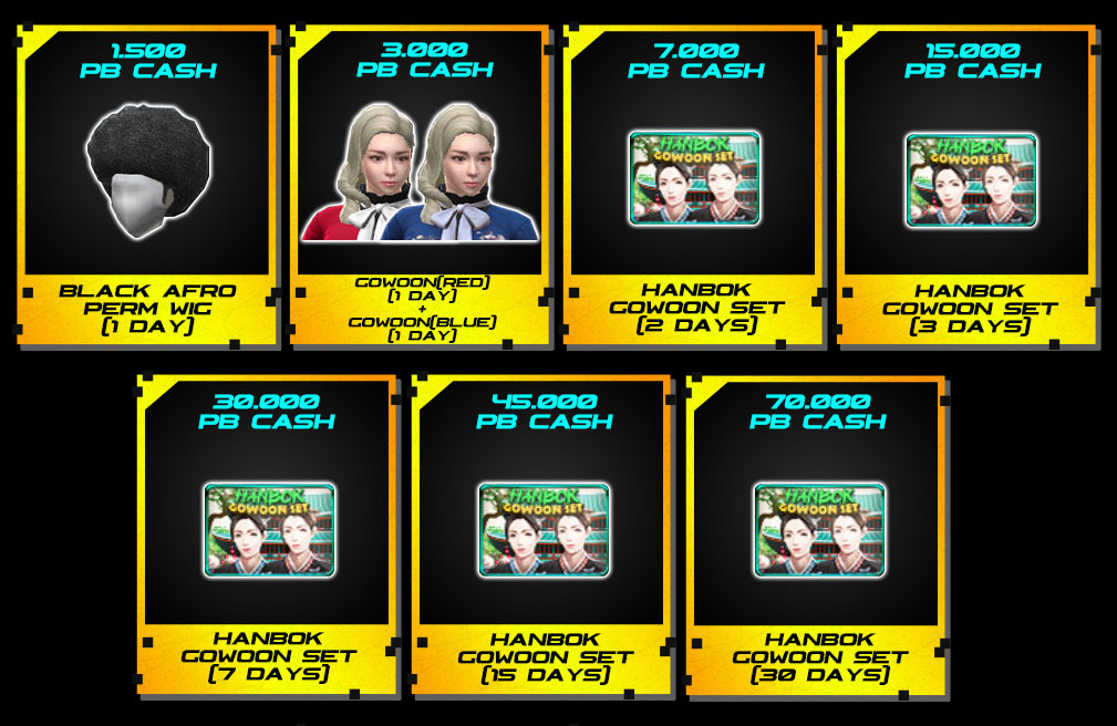 *(Special Reward Item per 1 User ID Max 1 Item Per Denom) Example: You have Top Up 1,500 PB Cash then you will get Rainbow Afro Perm Wig (1 Day) then you Top Up again 7,000 PB Cash then you will get Hanbok Gowoon Set (2 Days) then you Top Up Again with the same Denomination of 1,500 or 7,000 PB Cash then you will NOT get the Reward again. **(Terms and conditions are subject to change at any time without prior notice) Contents of HANBOK GOWOON SET: