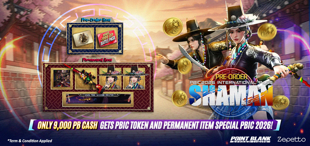 2. To Pre-Order Premium Battle Pass Troopers Simply Purchase Battle Pass Pre-Sale Ticket 19 in the In-Game Shop 3. Please only purchase the Battle Pass Pre-Sale Ticket 19 1 time per 1 Account If you buy the Battle Pass Pre-Sale Ticket 19 Item more than once then the items that have been purchased NON-REFUNDABLE / NON-REFUNDABLE NOTE : (Bonus 1000 EXP Battle Pass DOES NOT APPLY to multiplication. If you purchase Item Battle Pass Pre-Sale Ticket 19 more than once then the Bonus 1000 EXP Battle Pass is only valid for once.) 4. If Troopers have successfully purchased this Pre-Order Item then on 24 February 2026 (After Maintenance) Troopers will automatically get PREMIUM Battle Pass Access and Bonus 1000 EXP Battle Pass and Battle Pass Pre-Sale Ticket 19 item will be automatically DELETED from your Inventory. NOTE : (For automatic access to PREMIUM Battle Pass activation, you must already have a Battle Pass Pre-Sale Ticket 19 item in your Inventory during the Pre-Order Period 17 - 23 February 2026) ![]() The following Battle Pass Pre-Sale Ticket 19 item display automatically grants PREMIUM Battle Pass Access and Bonus 1000 EXP Battle Pass during the Battle Pass Period : ![]() *Image above is an ILLUSTRATION of Automatic Access to Premium Battle Pass and will also immediately give you a 1000 EXP Battle Pass Bonus 5. After the Pre-Order Event Period ends the Battle Pass Pre-Sale Ticket 19 item will not be available in the In-Game Shop. 6. Expired Item Battle Pass Pre-Sale Ticket 19 is only until the PBIC 2026 INTERNATIONAL PASS : SHAMAN Period ends If you already have a Battle Pass Pre-Sale Ticket 19 Item during the Pre-Order period but you do not login until the PBIC 2026 INTERNATIONAL PASS : SHAMAN Period Ends then the item will AUTOMATICALLY REMOVED from your inventory. 7. Make sure your Inventory Slot is not full during the Battle Pass Period if you want to activate the PREMIUM Battle Pass automatically. 8. If Troopers already have a Battle Pass Pre-Sale Ticket 19 Item not automatically activated PREMIUM Battle Pass then please click "USE" the Battle Pass Pre-Sale Ticket 19 Item in your Inventory during the Battle Pass Period on 24 February 2026 (After Maintenance) before the Battle Pass Pre-Sale Ticket 19 Item expired i.e. until the PBIC 2026 INTERNATIONAL PASS : SHAMAN Period ends. 9. All Items, Terms & Times are subject to change without prior notice. ============================================ ![]() This Battle Pass is a Seasonal Event in Point Blank with an Event Period of 50 Days and Max Level 60. You can get a variety of amazing items at each Battle Pass level increase. You can see the Battle Pass at the bottom left of the lobby after selecting the server. ![]() Some Special Items that you can get from PBIC 2026 INTERNATIONAL PASS : SHAMAN ![]() ![]() ![]() ![]() ![]() ![]() ![]() ![]() ![]() ![]() ![]() ![]() ![]() ![]() ![]() ![]() Emote Gesture Feature and Emote Gesture Item ![]() ![]() and many other kinds of rewards. You can redeem PBIC Token Items with Battle Pass Items or Permanent Items When you have successfully collected a certain amount of PBIC Token In this Battle Pass there will be a Special Item that will make your weapon Camouflaged / Looks Disappearing This item will ONLY be available in the Battle Pass Premium Shop ![]() ![]() From this Battle Pass, you can also get 100% Permanent Item without being raffled. only by increasing the Battle Pass Level: ![]() ![]() ![]() ![]() ![]() ![]() IMPORTANT INFO : In This PBIC 2026 INTERNATIONAL PASS : SHAMAN, REPAIR PERMANENT ITEMS that you get from PBIC 2026 INTERNATIONAL PASS : SHAMAN will use Point However, the Point Cost required for Repair will be greater than that of Permanent Item obtained from the Regular Permanent Random Box