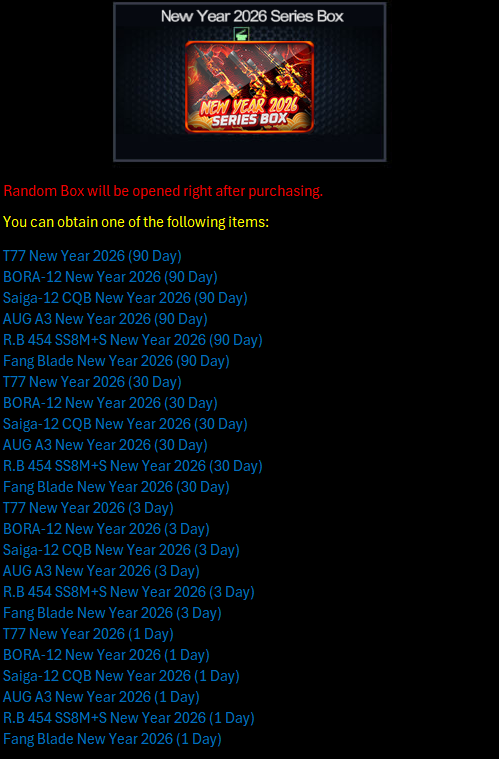 Hi Troopers !! In this March 3, 2026 Update, Born from the Deep Sea to Conquer the Entire Land! Check out this latest update soon. ![]() Available in Shop : March 3 - 16, 2026 Deep Sea 4 Main Weapon ![]() ============================================================== ![]() Hi, Troopers! Get various Permanent Weapon Tarantula Series, Permanent Idol Characters and Permanent Wigs from the newest Special Random Box. In addition to Permanent Items, you can also obtain extra PBIC Vote Tickets and PBIC Tokens from the Special Random Box below : Available in Shop : February 24 - April 27, 2026 ![]() Below are the stats of the Permanent Wig : Ash Grey Wave Dango Wig (Permanent) ![]() Brown Hairpin Updo Wig (Permanent) ![]() ============================================================== ![]() Hi Troopers,