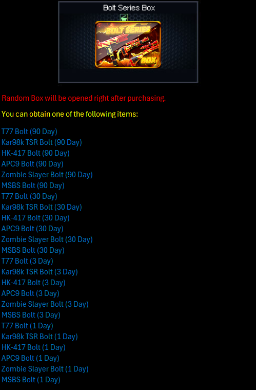 Here’s a brief preview of the map. ![]() ![]() ============================================================== ![]() Hi, Troopers! Get various Permanent Weapon Tarantula Series, Permanent Idol Characters and Permanent Wigs from the newest Special Random Box. In addition to Permanent Items, you can also obtain extra PBIC Vote Tickets and PBIC Tokens from the Special Random Box below : Available in Shop : February 24 - April 27, 2026 ![]() Below are the stats of the Permanent Wig : Ash Grey Wave Dango Wig (Permanent) ![]() Brown Hairpin Updo Wig (Permanent) ![]() ============================================================== ![]() Hi Troopers,