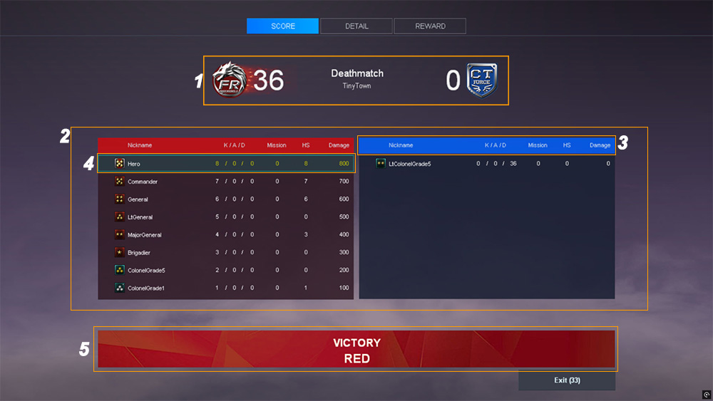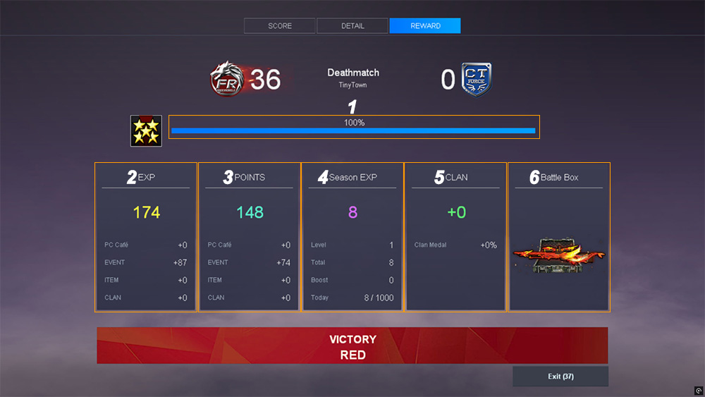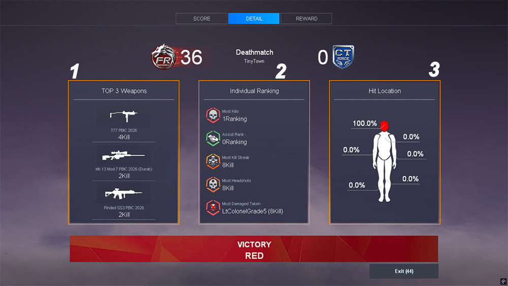 Displays the nickname and total kills of the player who received the most damage from you in a match. 3. Hit Location Displays the percentage of damage and hit locations dealt to enemies in a match. ![]() REWARD Tab 1. Experience Bar Indicator - Displays the percentage of your current EXP progress. A yellow animation will appear when EXP is gained. 2. EXP
