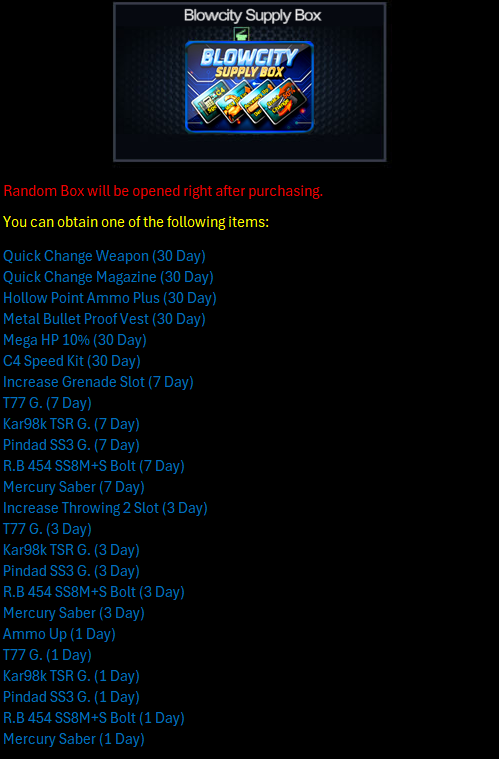 Terms Conditions: 1. Especially for IDs who have NEVER spent / purchased items using PB Cash. 2. To purchase the type of Starter Pack with the duration & discount you want, you must reach a certain Total Login / Attendance. Example : Want to Buy Starter Pack T77 Gold with a Duration of 30 Days & Discount 80% Then you must reach a Total Login / Attendance of 5 Days first so that the Starter Pack T77 Gold discount promo with a Duration of 30 Days & Discount 80% comes out / appears in-game. 3. If you have reached a certain Total Login / Attendance, then the promo items that have been provided above with the previous duration WILL NOT come out / appear again. Example : You have reached a Total Login / Attendance of 3 Days then the promo Starter Pack T77 Gold, Starter Pack Kar98k TSR Gold, and Starter Pack Pindad SS3 Gold with a Duration of 7 Days & Discount 75% will come out / appear in the game and Duration of 3 Days with Discount 70% WILL NOT come out / appear again. 4. 1 Account only HAS 1X CHANCE to purchase among the promo items with the duration provided. Example : Already Purchased One of the Discounted Starter Pack Items on Attendance Day 1 then you WILL NOT be able to purchase Discounted Starter Pack Items on Attendance Day 3 and Day 5. 5. For those of you who have purchased items using PBCash before, the items above will not come out / appear. |