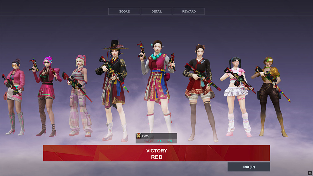 - Showroom Background Default background with a smoky fog effect that will appear in the battle result across all modes. - Player Display Displays all characters from the winning team along with their respective weapons (top weapon kill).