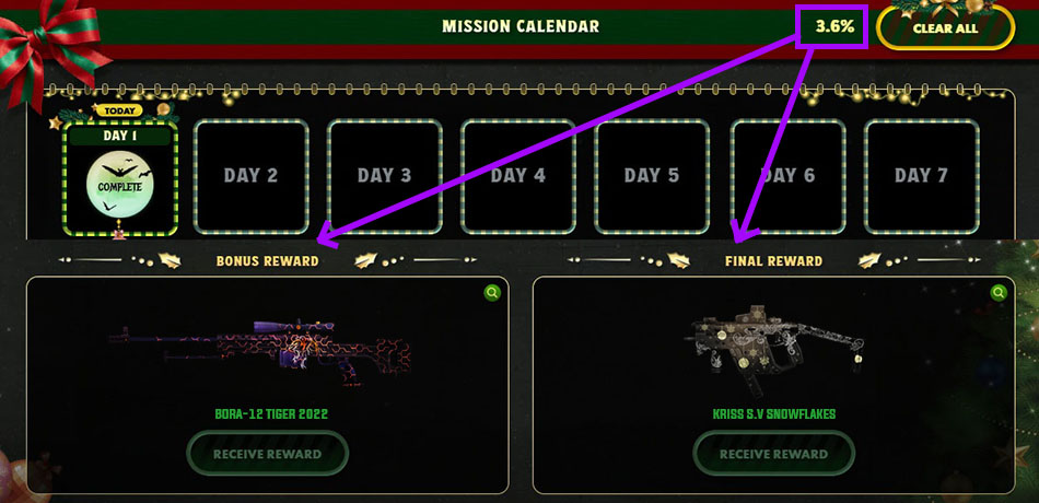 Requirements to Receive Additional Mission Calendar Reward You must complete all Daily Missions every day during the event period and reach a certain total percentage on the Mission Calendar. ![]()