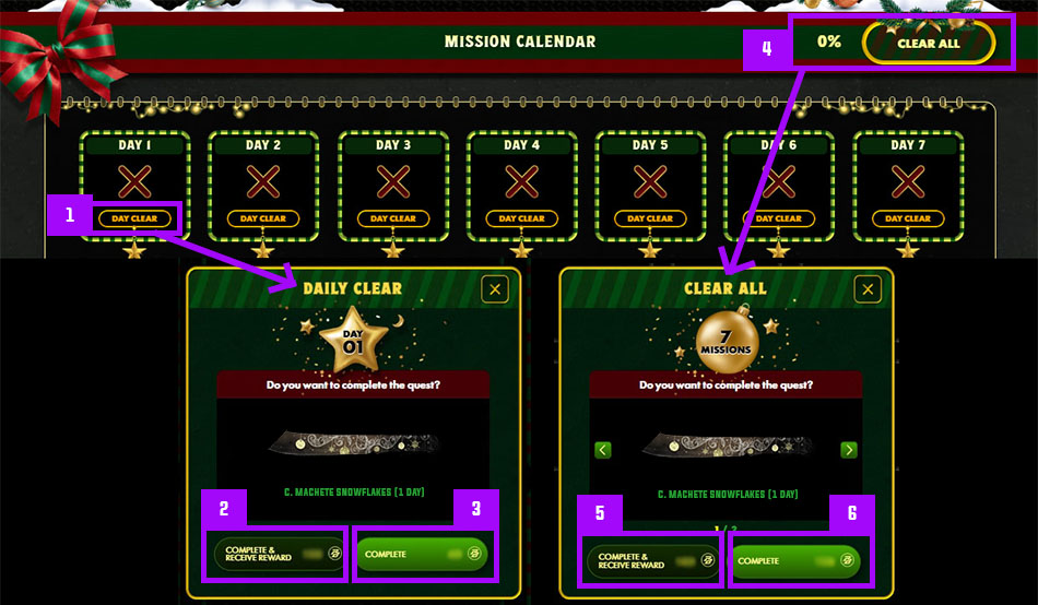 4. The Clear All feature allows you to complete all missed Mission Calendar entries at once. 5. If you choose the "Complete & Receive Reward" option in the Clear All feature,