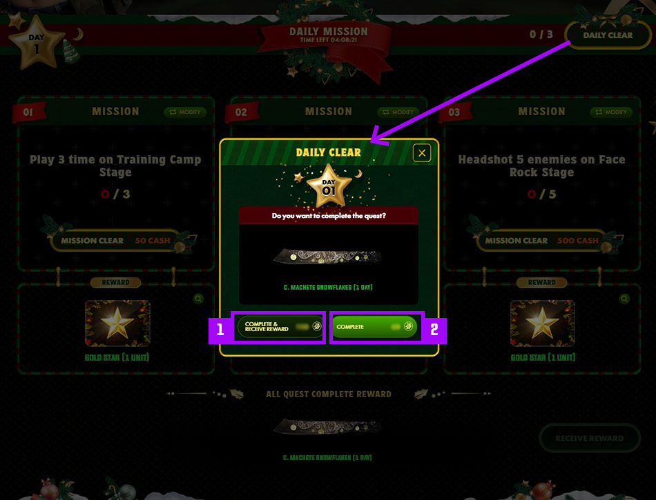 3. You can instantly complete all 3 daily missions using PB Cash by clicking the DAILY CLEAR button ![]() IMPORTANT : If you choose Daily Clear to complete all 3 daily missions at once, you can select 2 Options ![]() 1. If you choose the "Complete & Receive Reward" option, you will receive ALL REWARDS from Mission 1, Mission 2, Mission 3, and the All Quest Complete Reward.