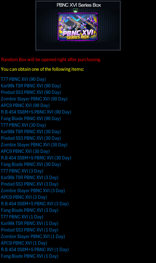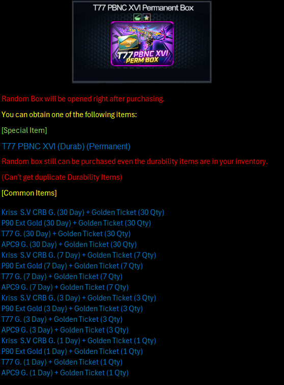 Terms Conditions: 1. Especially for IDs who have NEVER spent / purchased items using PB Cash. 2. To purchase the type of Starter Pack with the duration & discount you want, you must reach a certain Total Login / Attendance. Example : Want to Buy Starter Pack T77 Gold with a Duration of 30 Days & Discount 80% Then you must reach a Total Login / Attendance of 5 Days first so that the Starter Pack T77 Gold discount promo with a Duration of 30 Days & Discount 80% comes out / appears in-game. 3. If you have reached a certain Total Login / Attendance, then the promo items that have been provided above with the previous duration WILL NOT come out / appear again. Example : You have reached a Total Login / Attendance of 3 Days then the promo Starter Pack T77 Gold, Starter Pack Kar98k TSR Gold, and Starter Pack Pindad SS3 Gold with a Duration of 7 Days & Discount 75% will come out / appear in the game and Duration of 3 Days with Discount 70% WILL NOT come out / appear again. 4. 1 Account only HAS 1X CHANCE to purchase among the promo items with the duration provided. Example : Already Purchased One of the Discounted Starter Pack Items on Attendance Day 1 then you WILL NOT be able to purchase Discounted Starter Pack Items on Attendance Day 3 and Day 5. 5. For those of you who have purchased items using PBCash before, the items above will not come out / appear. |