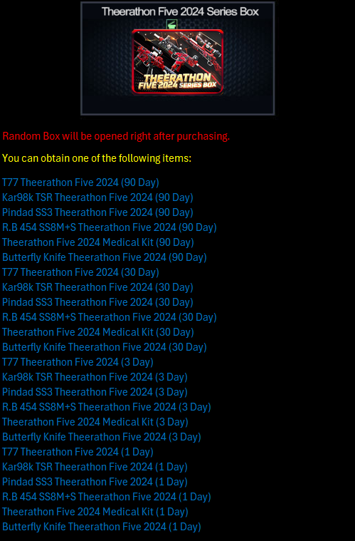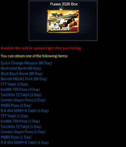 Hi Troopers !! In this February 24, 2026 Update, Weapon Series New Year 2026 with a Fire Horse Illustration, Ready to Join your Battles! Check out this latest update soon. ![]() Available in Shop : February 24 - March 9, 2026 New Year 2026 2 Main Weapon, 1 Melee Weapon and 1 Special Weapon ![]() ============================================================== ![]() Hi, Troopers! Get various Permanent Weapon Tarantula Series, Permanent Idol Characters and Permanent Wigs from the newest Special Random Box. In addition to Permanent Items, you can also obtain extra PBIC Vote Tickets and PBIC Tokens from the Special Random Box below : Available in Shop : February 24 - April 27, 2026 ![]() Below are the stats of the Permanent Wig : Ash Grey Wave Dango Wig (Permanent) ![]() Brown Hairpin Updo Wig (Permanent) ![]() ============================================================== ![]() Hi Troopers,