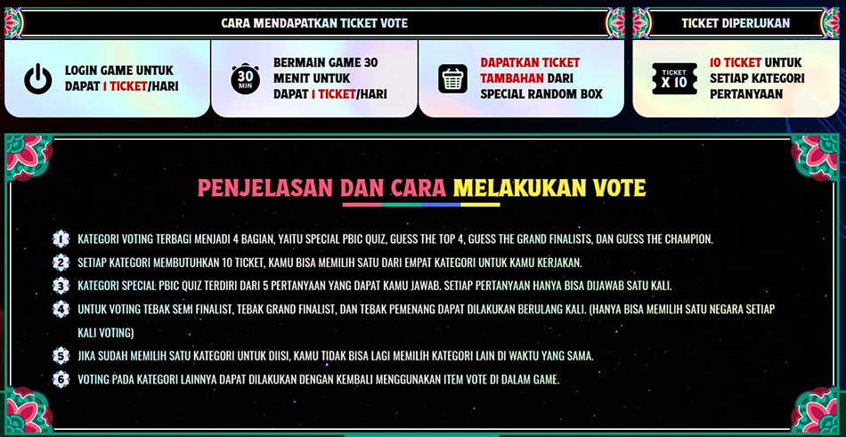 Hi Troopers! Ahead of PBIC 2026 this time you can take part in the Vote Event you know You can vote for 8 PBIC 2026 Vote Categories, namely Vote for Guess 5 Special PBIC Quiz, Guess Semi Finalist (Top 4), Guess Grand Finalist, and Guess PBIC 2026 Winner. The trick is you have to collect PBIC Vote Ticket from Login to the Game, Playtime 30 Minutes or Random Box have a minimum of 10 Units to be able to vote in the following Event Periods: