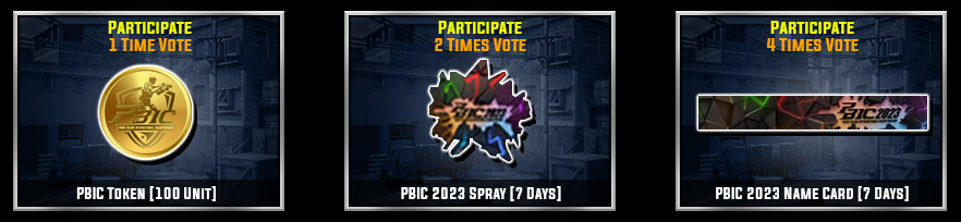 Reward Vote : All Troopers Achieve Vote Participation with a CERTAIN TOTAL During the Event Period February 24 - March 23, 2026 ![]() ![]() *Reward NOT Accumulated Example: Troopers managed to do 4 votes then the rewards you will get are PBIC Token [100 Units], PBIC 2023 Spray [7 Days] and PBIC 2023 Name Card [7 Days] **After a successful vote, the Item vote reward will be given 14 Business Days AFTER the event period ends. ***Items, Terms & Times are subject to change at any time without prior notice =========================== All Troopers Correctly Guess a Category with a CERTAIN TOTAL During Event Period February 24 - March 23, 2026 ![]() ![]()