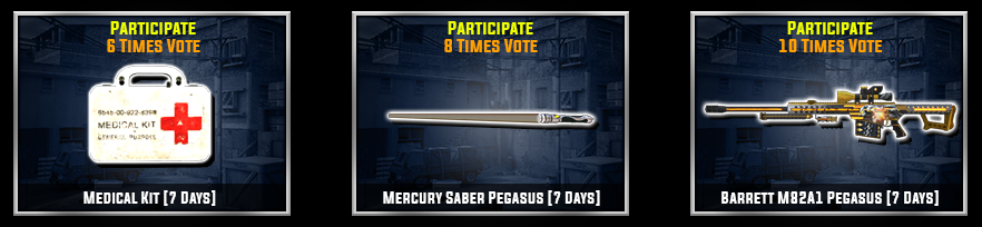 *Reward only for Lucky Troopers who successfully guess according to the Terms & Conditions above **After a successful vote, the Item vote reward will be given 14 Working Days AFTER the event period ends. ***Items, Terms & Times are subject to change at any time without prior notice ===========================