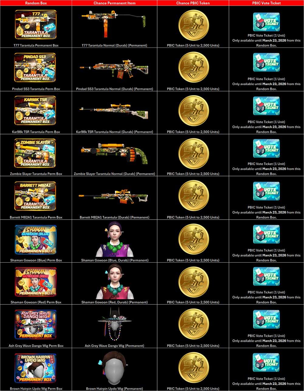 * Time & Reward Items are subject to change without prior notice. ![]() Hi, Troopers! Get various Permanent Weapon Tarantula Series, Permanent Idol Characters and Permanent Wigs from the newest Special Random Box. In addition to Permanent Items, you can also obtain extra PBIC Vote Tickets and PBIC Tokens from the Special Random Box below : Available in Shop : February 24 - April 27, 2026 ![]() --------------- | ||||||||||||||||||||||||||||||||||||||||||||||||||||||||||||||||||||||||||||||||||||||||||||||||||||||||||||||||||||||||||||||||||||||||||||||||||||||||||||||||||||||||||||||||||||||||||||||||||||||||||||||||||||||||||||||||||||||||||||||||||||||||||||||||||||||||||||||||||||||