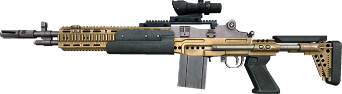 M14 EBR, designated marksman rifle chambered with a 7.62x51mm NATO cartridge. It is a variant of the M14 battle rifle with telescoping chassis stock system.