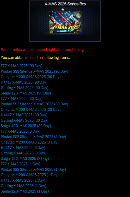 Hi Troopers !! In this December 30, 2025 Update, Weapon Series X-MAS 2025 is here to bring happiness to your Christmas & New Year! Check out this latest update soon. ![]() Available in Shop : 30 Desember 2025 - 12 Januari 2026 X-MAS 2025 3 Main Weapon ![]() ============================================================== ![]() Hi Troopers, After the Maintenance December 23, 2025 there will be a special discount promotion for Mission Card that you definitely don't want to miss! Here is the list of Mission Card that will receive the discount promotion. Event Period : December 23, 2025 - January 5, 2026