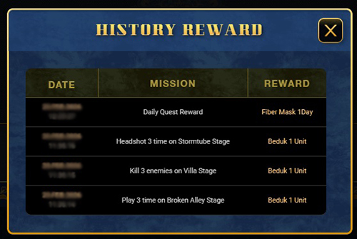 You can also check the types of quests you have received and the rewards you have claimed by clicking the HISTORY button. ![]() ![]() |