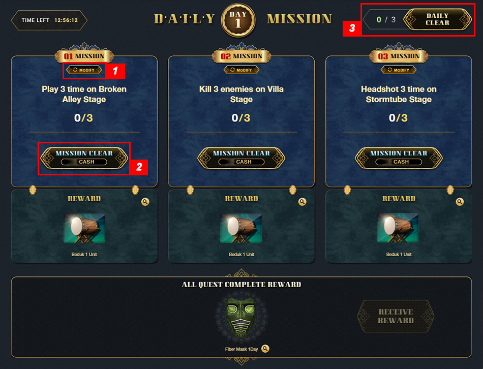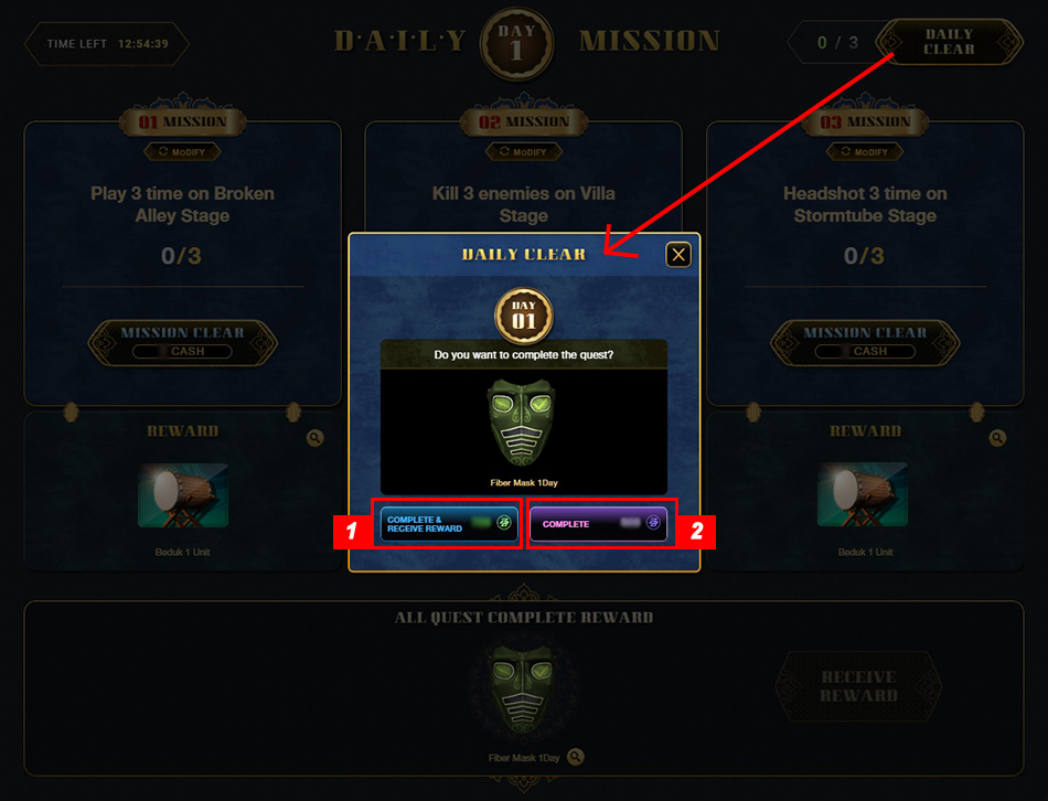 1. You can replace a mission once by clicking the MODIFY button 2. You can instantly complete a mission using PB Cash by clicking the MISSION CLEAR button 3. You can instantly complete all 3 daily missions using PB Cash by clicking the DAILY CLEAR button ![]() IMPORTANT : If you choose Daily Clear to complete all 3 daily missions at once, you can select 2 Options ![]() 1. If you choose the "Complete & Receive Reward" option, you will receive ALL REWARDS from Mission 1, Mission 2, Mission 3, and the All Quest Complete Reward.
