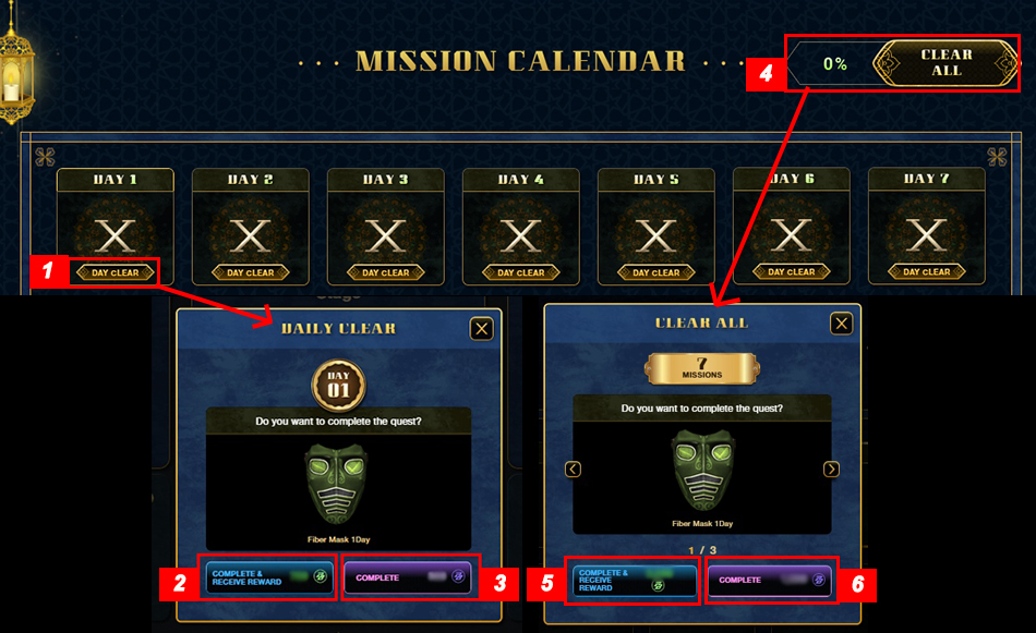 4. The Clear All feature allows you to complete all missed Mission Calendar entries at once. 5. If you choose the "Complete & Receive Reward" option in the Clear All feature, all stamp missions for the missed days will be automatically completed. However, you will ONLY receive the All Quest Complete Reward for all the missed days. (Rewards from Mission 1, Mission 2, and Mission 3 will NOT be given.) Example: If missions from Day 1 to Day 7 were missed and you select "Complete & Receive Reward" , the Completed stamp will appear for Day 1 to Day 7 at once, and you will receive the Final Reward for Day 1 to Day 7. ![]() +
