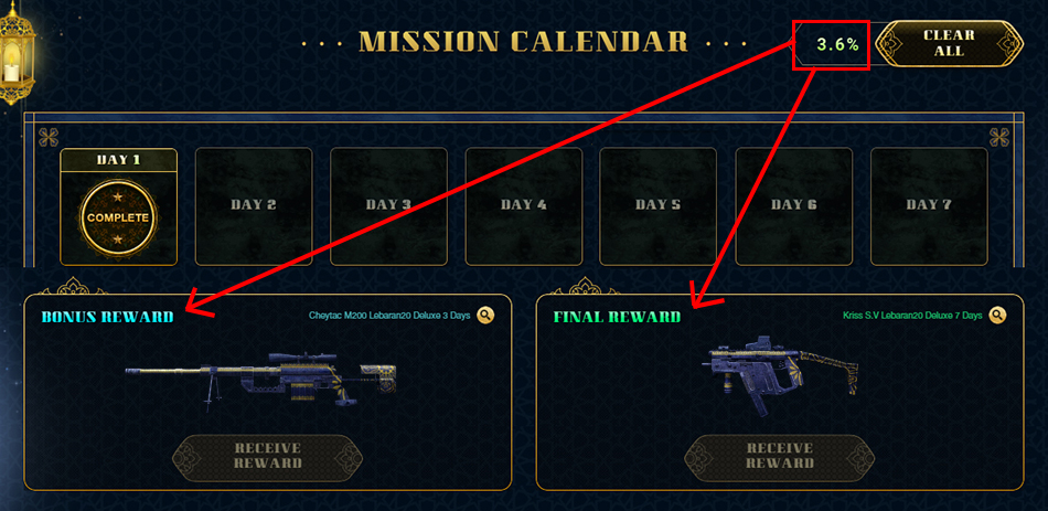 Requirements to Receive Additional Mission Calendar Reward You must complete all Daily Missions every day during the event period and reach a certain total percentage on the Mission Calendar. ![]()