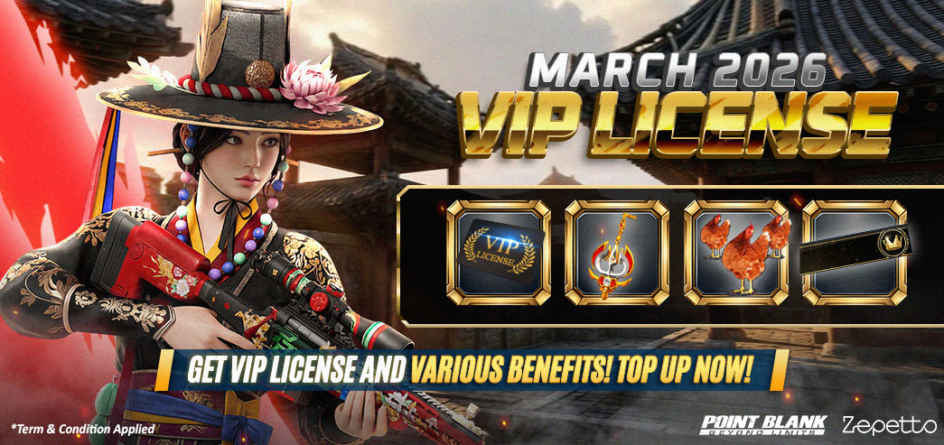 Hi, Troopers! This Month VIP License is back again!!! For all Troopers who purchase PB Cash with a total accumulated Top Up of 12,000 PB Cash will immediately get various Rewards in the form of Special Items. Immediately use your VIP License before the EXPIRED date. Period Starting: March 5, 2026 (starting 1 AM) - March 31, 2026 (until 1 AM) Total accumulated top up 12,000 PB Cash ![]() ![]() Terms and Conditions: 1. 30 Days VIP License (Extend) will be EXPIRED / DELETED from Inventory automatically on April 1, 2026.