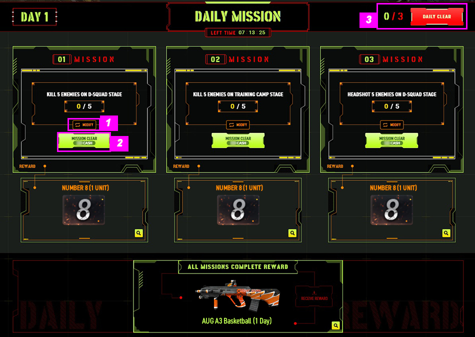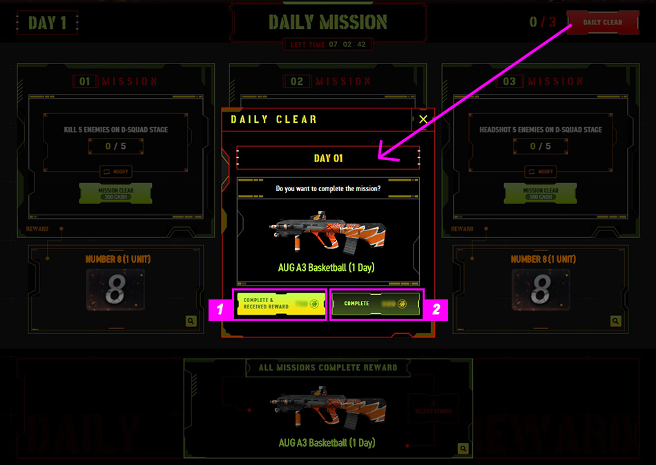 3. You can instantly complete all 3 daily missions using PB Cash by clicking the DAILY CLEAR button ![]() IMPORTANT : If you choose Daily Clear to complete all 3 daily missions at once, you can select 2 Options ![]() 1. If you choose the "Complete & Receive Reward" option, you will receive ALL REWARDS from Mission 1, Mission 2, Mission 3, and the All Quest Complete Reward.
