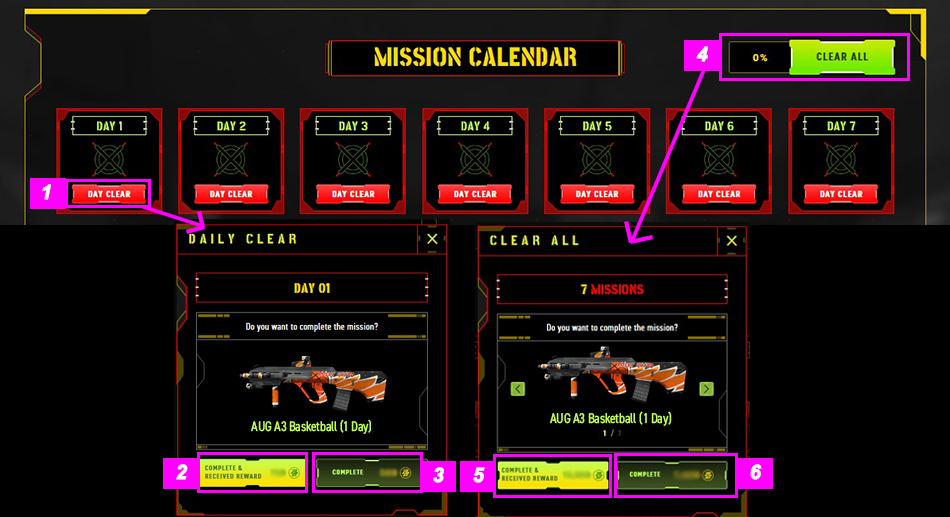 4. The Clear All feature allows you to complete all missed Mission Calendar entries at once. 5. If you choose the "Complete & Receive Reward" option in the Clear All feature,