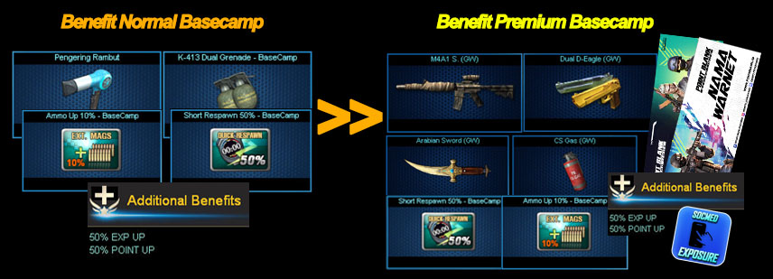 Because there are more benefits and enjoy a different Permanent Ingame Weapon every month. To Upgrade to Premium Basecamp you must have Registered to Normal Basecamp first.