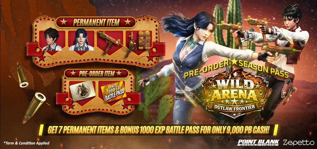 This time the Season Pass theme is SEASON PASS WILD ARENA : OUTLAW FRONTIER You can order this Season Pass for only 9,000 PB Cash and with a Bonus 1000 EXP Season Pass so that LEVEL UP is easier and can get Permanent Items faster! You only need to purchase the following items in the in-game shop to make a Pre-Order ![]() The Battle Pass Pre-Sale Ticket 20 item will grant you Automatic Access to the PREMIUM Season Pass and will also instantly grant you a Bonus 1000 EXP Season Pass during the Season Pass Period. ![]() *Image above is an ILLUSTRATION of Automatic Access to Premium Season Pass and will also immediately give you a 1000 EXP Season Pass Bonus Pre-Order Term & Condition : 1. Pre-Order is Open from 21 April (After Maintenance) - 27 April 2026 (Until 01.00 AM).
