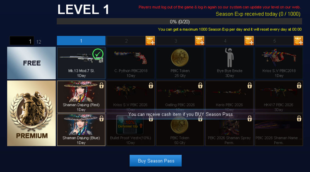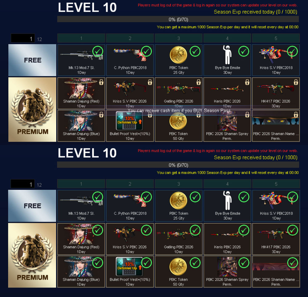This Battle Pass is a Seasonal Event in Point Blank with an Event Period of 50 Days and Max Level 60. You can get a variety of interesting items at each Battle Pass level increase. You can see the Battle Pass at the bottom left of the lobby after selecting the server. ![]() Battle Pass will be divided into 2, namely Free and Premium After logging in you will get Free Battle Pass Level 1 ![]() You can get additional Battle Pass Rewards by Purchasing a Premium Battle Pass by using PB Cash ![]() If in the Free Battle Pass you have reached a certain level then once you buy the Premium Battle Pass Your Premium Battle Pass level will also be the same as the Free Battle Pass. All Premium Battle Pass Rewards will also be immediately received according to the level you have reached. ![]() To Level Up Battle Pass, you need Season EXP There are several ways to get season experience The first way is to complete the Battle Game Season EXP from Battle Games has a maximum Limit of 1000 Season EXP from Battle Results per day if you have reached the limit you will no longer get Season EXP from the Battle Results on that day ![]() The second way you can get Season EXP by buying Season EXP at the Battle Pass Level Menu you want. 1 EXP = 7 PB Cash The amount of PB Cash needed depends on the amount of EXP needed to the level you want Example: To reach the level you want requires 200 EXP