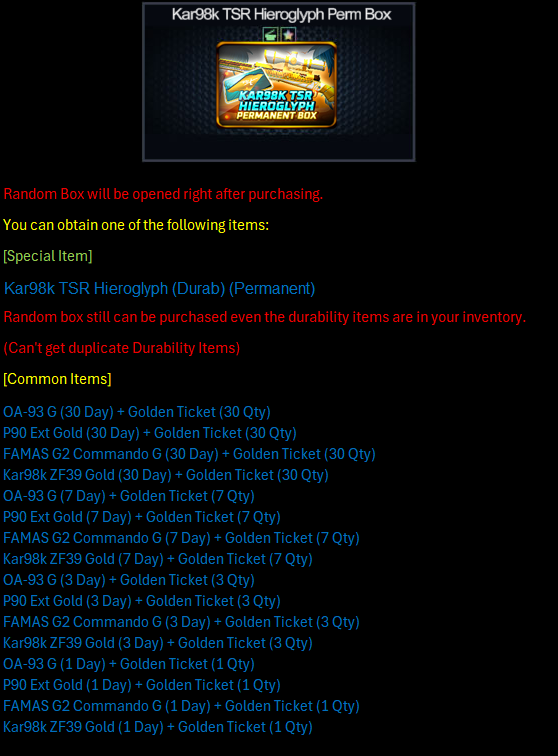 Terms Conditions: 1. Especially for IDs who have NEVER spent / purchased items using PB Cash. 2. To purchase the type of Starter Pack with the duration & discount you want, you must reach a certain Total Login / Attendance. Example : Want to Buy Starter Pack T77 Gold with a Duration of 30 Days & Discount 80% Then you must reach a Total Login / Attendance of 5 Days first so that the Starter Pack T77 Gold discount promo with a Duration of 30 Days & Discount 80% comes out / appears in-game. 3. If you have reached a certain Total Login / Attendance, then the promo items that have been provided above with the previous duration WILL NOT come out / appear again. Example : You have reached a Total Login / Attendance of 3 Days then the promo Starter Pack T77 Gold, Starter Pack Kar98k TSR Gold, and Starter Pack Pindad SS3 Gold with a Duration of 7 Days & Discount 75% will come out / appear in the game and Duration of 3 Days with Discount 70% WILL NOT come out / appear again. 4. 1 Account only HAS 1X CHANCE to purchase among the promo items with the duration provided. Example : Already Purchased One of the Discounted Starter Pack Items on Attendance Day 1 then you WILL NOT be able to purchase Discounted Starter Pack Items on Attendance Day 3 and Day 5. 5. For those of you who have purchased items using PBCash before, the items above will not come out / appear. |