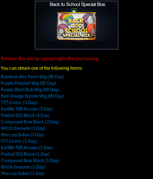 Hi Troopers !! In this March 31, 2026 Update, Cold-Blooded Combat Awaits, Dominate with The Serpent Weapon Series! Check out this latest update soon. ![]() Available in Shop : March 31 - April 13, 2026 Serpent 3 Main Weapon and 1 Special Weapon ![]() ============================================================== ![]() Hi, Troopers! Get various Permanent Weapon Tarantula Series, Permanent Idol Characters and Permanent Wigs from the newest Special Random Box. In addition to Permanent Items, you can also obtain extra PBIC Vote Tickets and PBIC Tokens from the Special Random Box below : Available in Shop : February 24 - April 27, 2026 ![]() Below are the stats of the Permanent Wig : Ash Grey Wave Dango Wig (Permanent) ![]() Brown Hairpin Updo Wig (Permanent) ![]() ============================================================== ![]() Hi Troopers,
